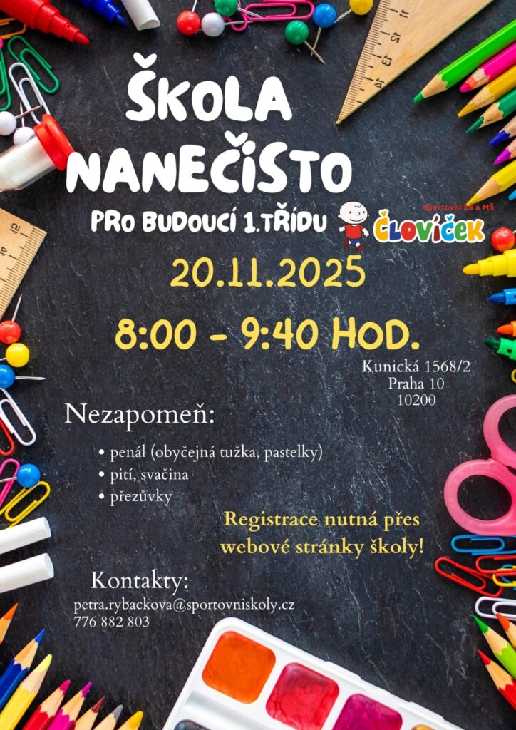 rádi bychom budoucí prvňáčky pozvali na další letošní školu nanečisto, která se uskuteční dne 20. 11. 2025 od 8:00 do 9:40 hodin v Kunické ulici 1568. Děti budou potřebovat pevné přezůvky, pití a penál s pastelkami.